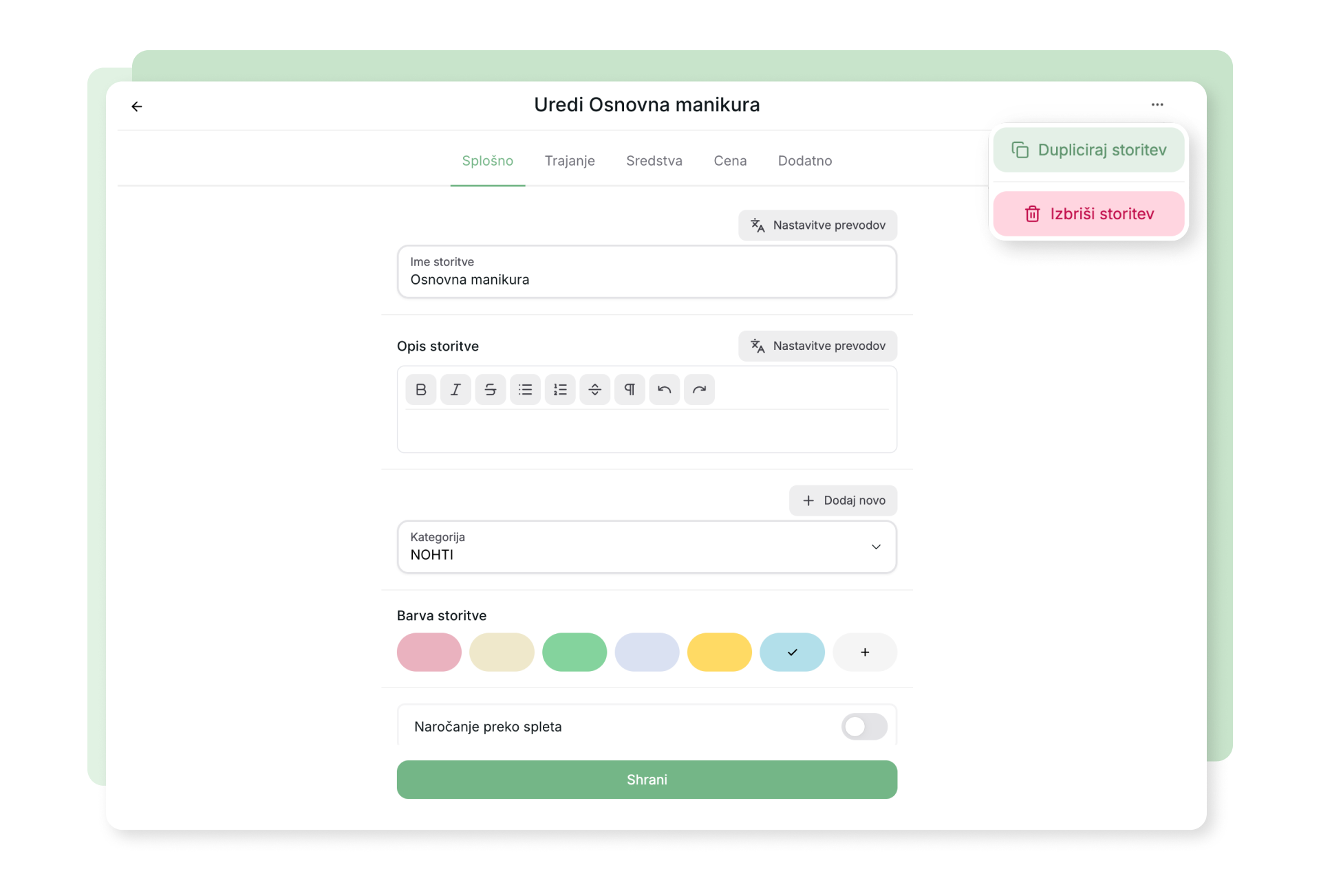 Urejanje storitev je zdaj še hitrejše. Z novo možnostjo “Duplicate service” lahko obstoječo storitev podvojite v le enem koraku. To pride prav, če imate več podobnih storitev (npr. “Striženje moško / otroško / brada”), kjer se razlikujeta le cena ali trajanje.